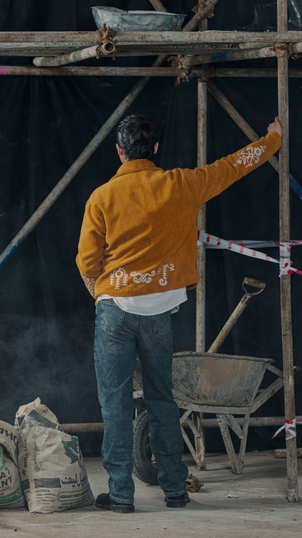 Make a chic statement with this mustard short jacket featuring intricate white arc embroidery on the front back & sleeves. Designed with full sleeves and a wide collar, this versatile piece effortlessly combines elegance with contemporary style, perfect for any occasion