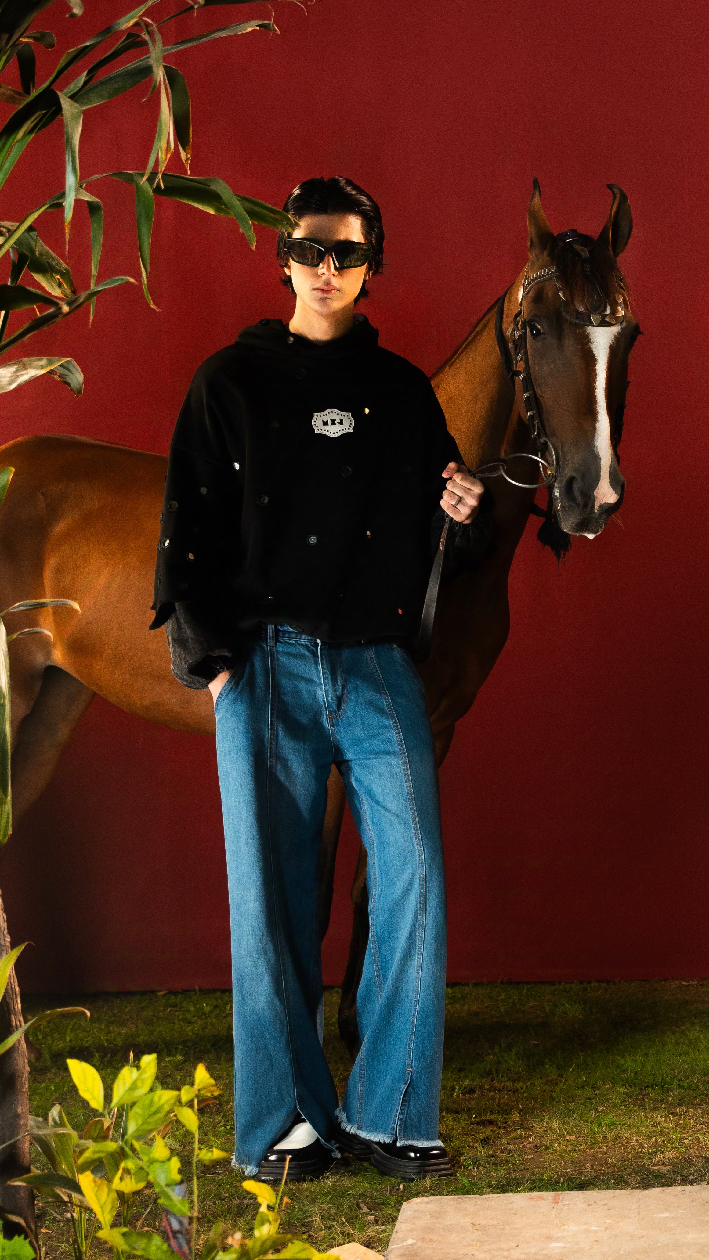 Shine bright in the Starlight Hoodie, where bold meets luxe. This stunning hoodie is adorned with intricate embroidered mirrors all over, creating a dazzling, reflective effect. The leather MXJ logo on the front adds a touch of sophistication, while the denim sleeves bring an edgy, modern twist. Perfect for those who love to stand out and sparkle in style.