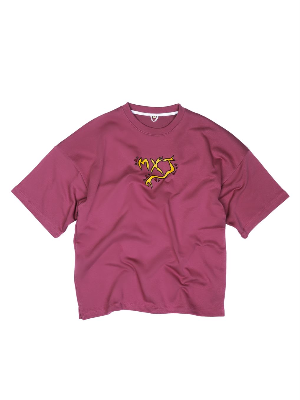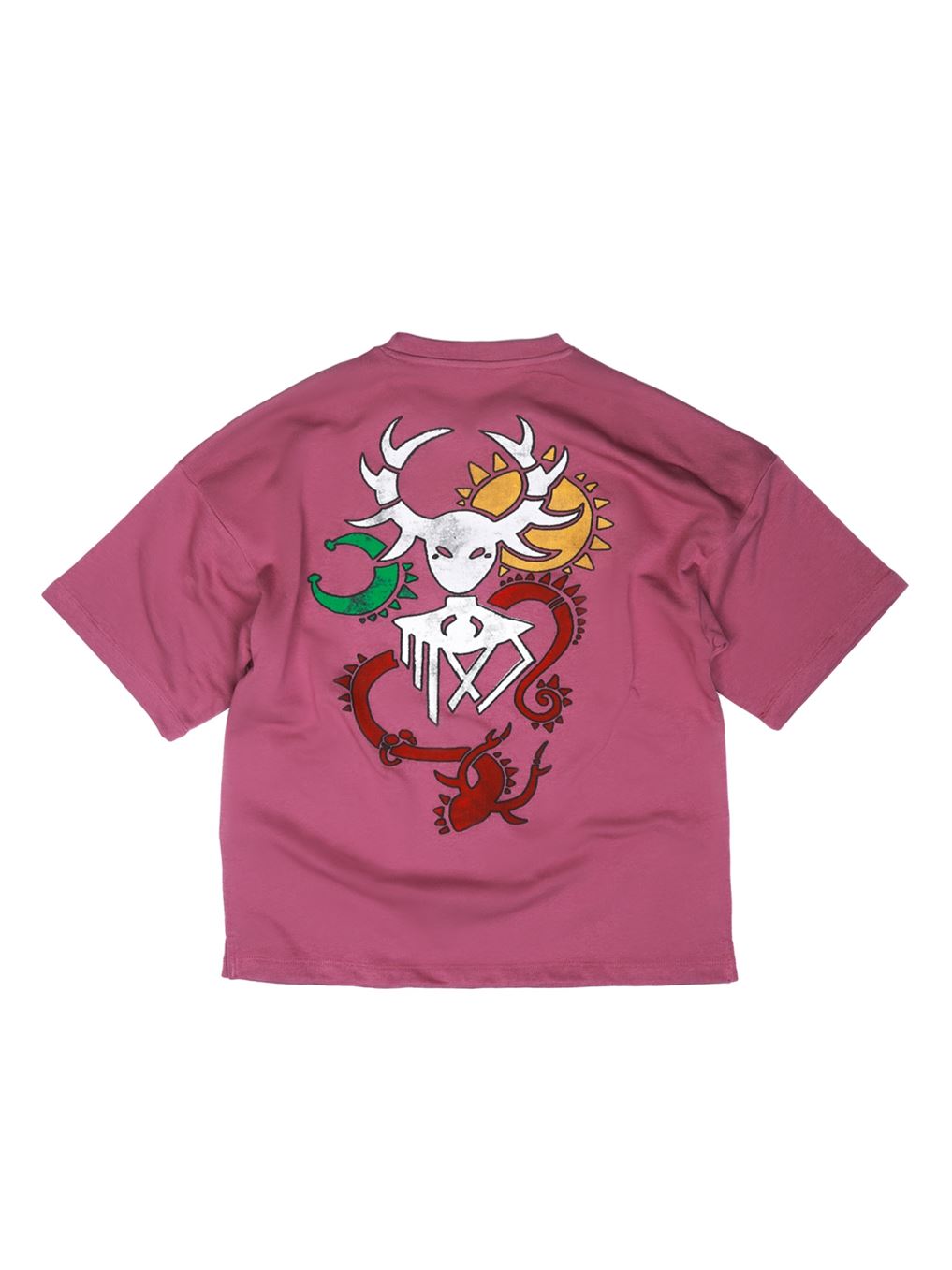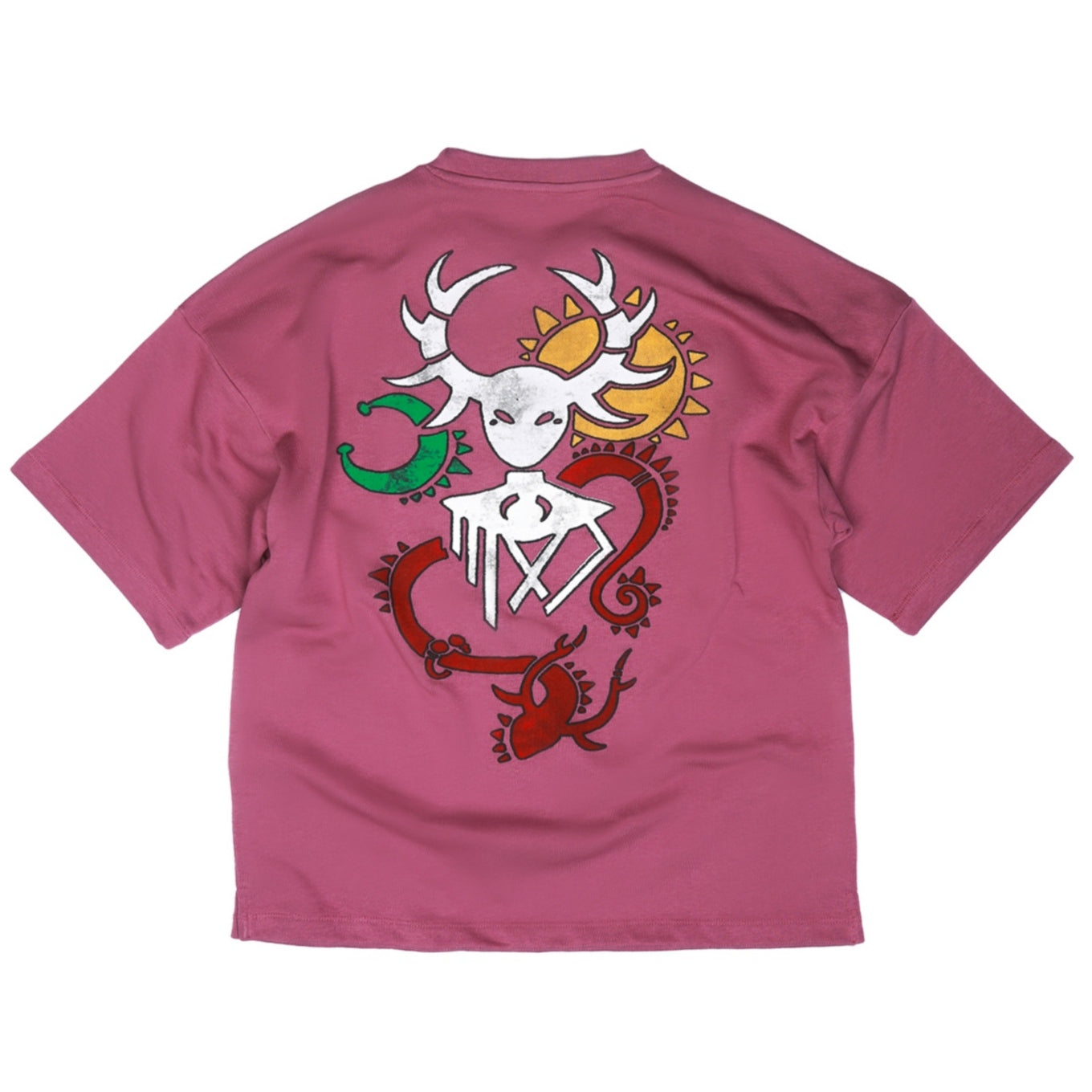 Elevate your wardrobe with our vibrant pink cotton shirt, featuring a bold MXJ logo prominently displayed on the front. Turn heads with the captivating artwork on the back, showcasing a radiant sun, majestic dragon, and enigmatic mysteriuous face in a spectrum of colors. Express your unique style and stand out from the crowd with this eye-catching statement piece